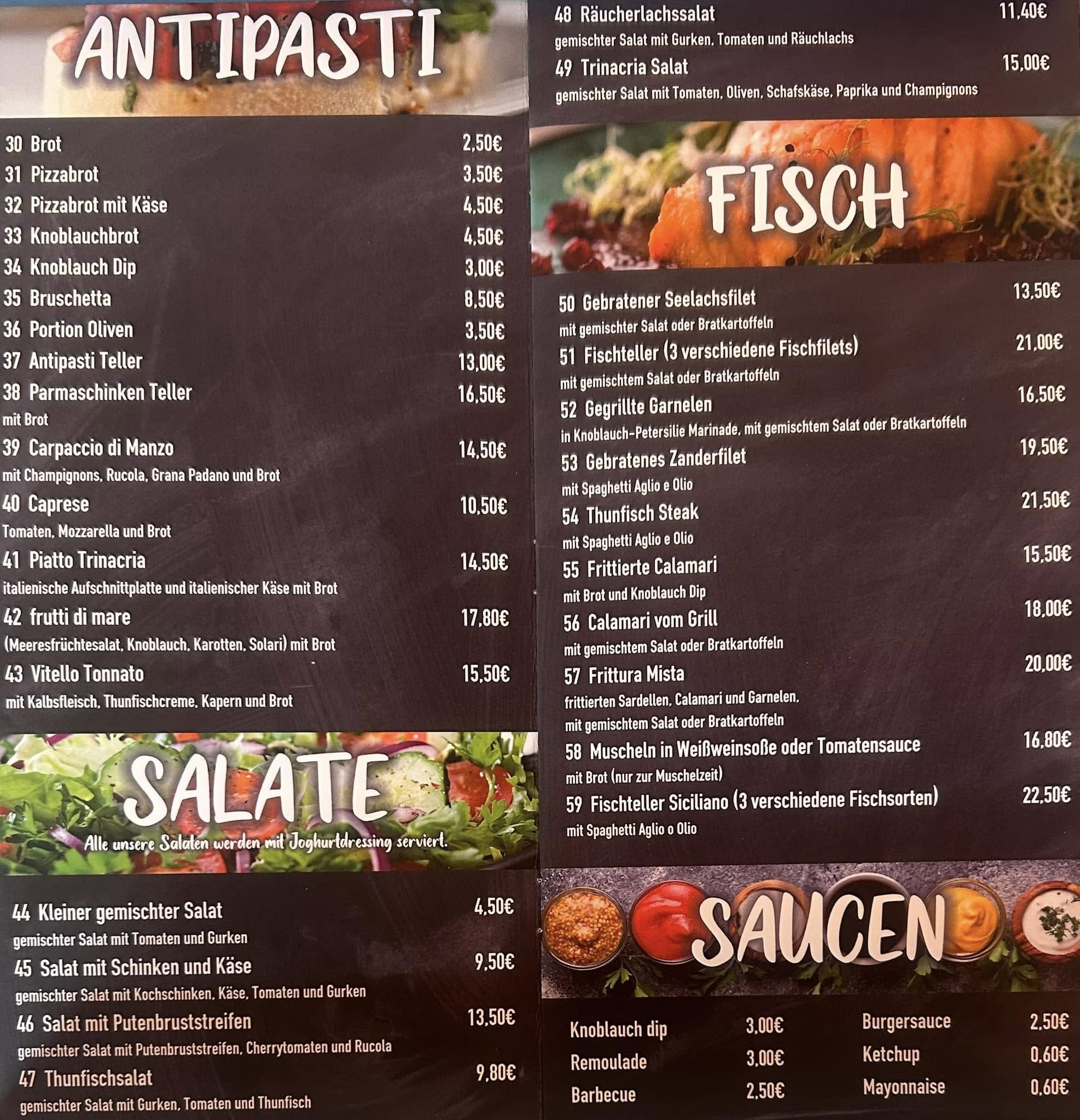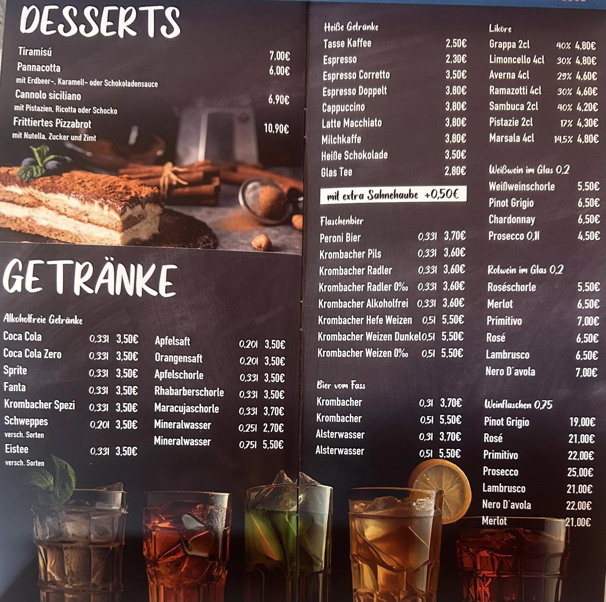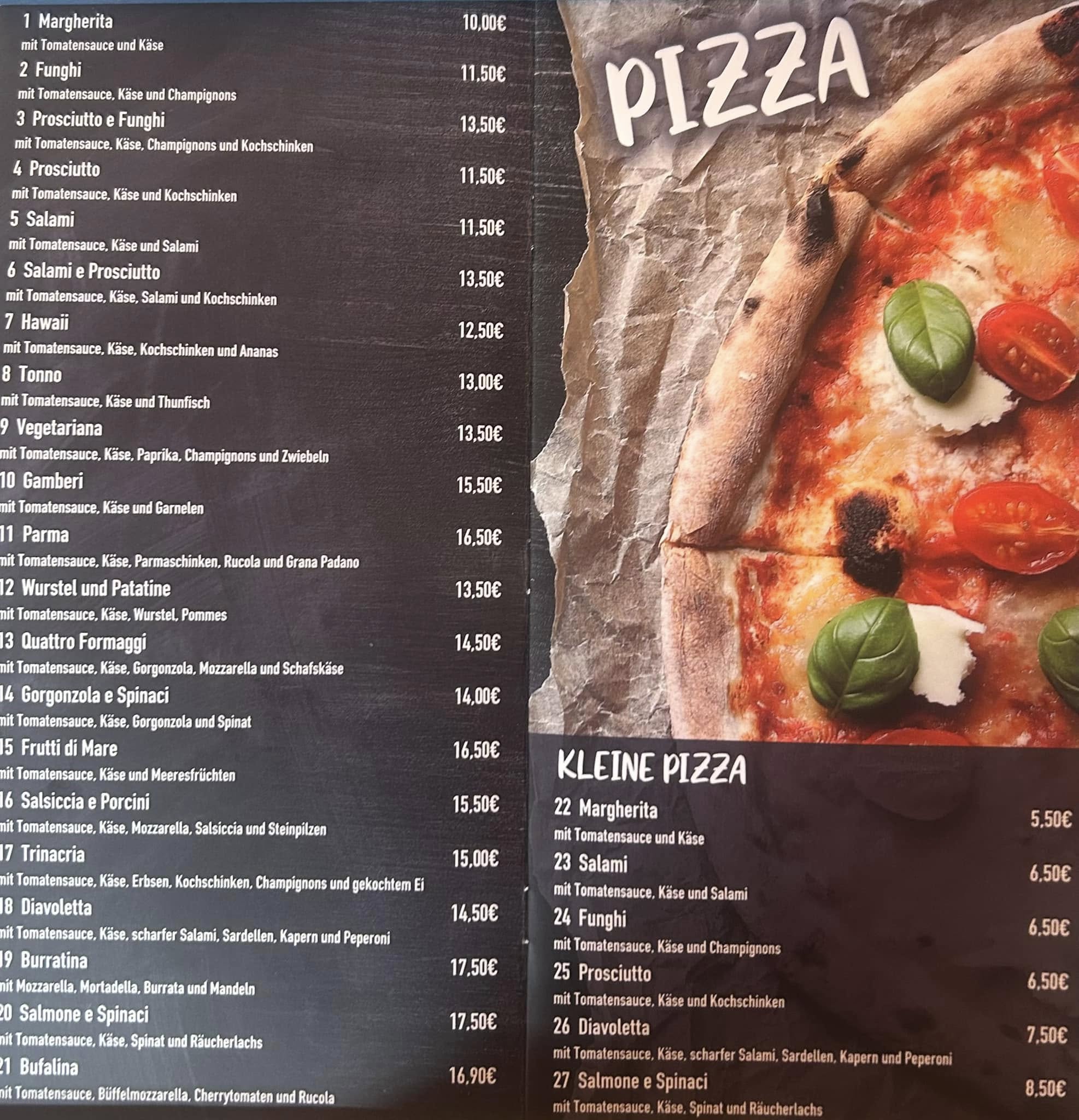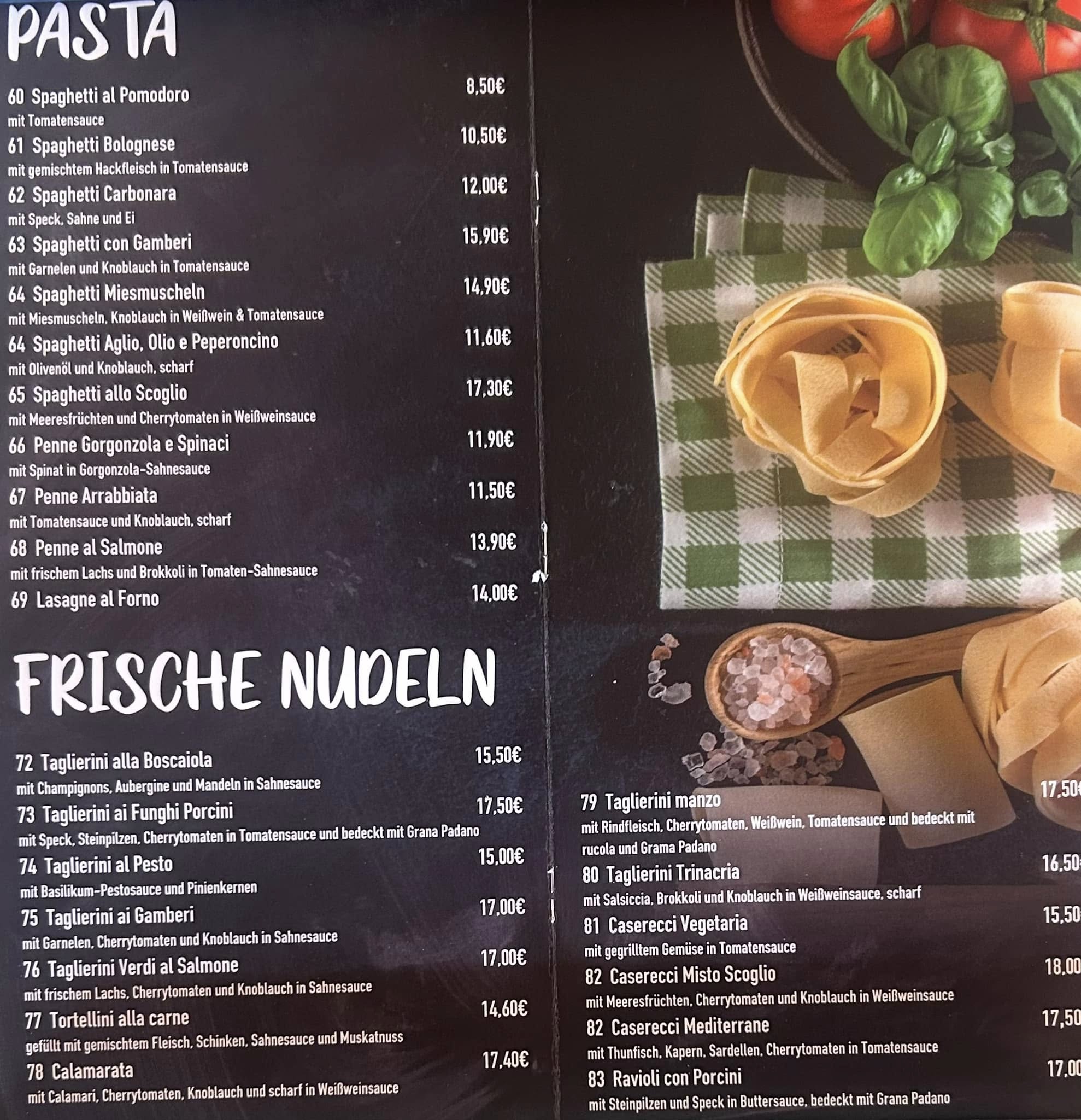 Unsere Speisekarte bietet euch eine Auswahl an klassischen italienischen Gerichten, die mit Sorgfalt und Leidenschaft zubereitet werden. Wir verwenden frische Zutaten, viele davon direkt aus Italien, und legen großen Wert auf Qualität und Portionen, die satt und glücklich machen.